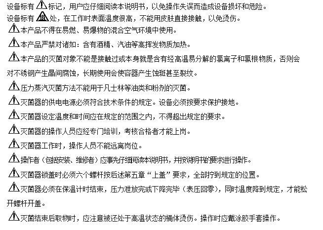 桶內蒸汽未放完(表壓沒有回零)和器內溫度沒有下降到低于滅菌對象沸點,不得開蓋。