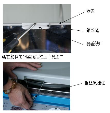 到達(dá)開蓋的溫度后,用左手扶壓住機(jī)蓋,右手手指拉出器蓋正前方缺口內(nèi)的鋼絲繩。(見圖一)